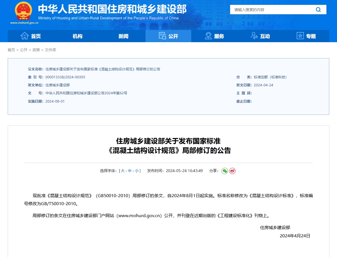 住房和城鄉(xiāng)建設(shè)部于2024年5月24日發(fā)布了《建筑抗震設(shè)計規(guī)范》(GB50011-2010)和《混凝土結(jié)構(gòu)設(shè)計規(guī)范》(GB50010-2010)局部修訂的公告,標準名稱及編號為《建筑抗震設(shè)...
