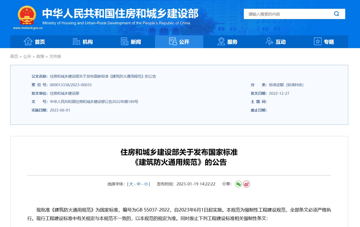 2023年1月19日,中華人民共和國住房和城鄉建設部公告2022年底189號文件發布,批準《建筑防火通用規范》為國家標準,編號為GB 55037-2022,自2023年6月1日起實施。本規范為強制性工程建設規范,全部條文必須嚴格執行。